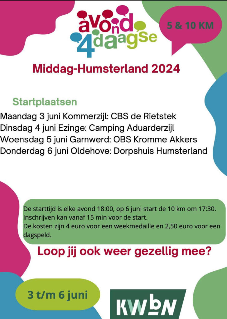 Vanaf morgen, maandag 3 juni, gaat hij weer van start, de avondvierdaagse. 4 x lopen door het mooie Groninger land, on- en offroad, op bijzondere plekken waar je niet eerder was geweest.