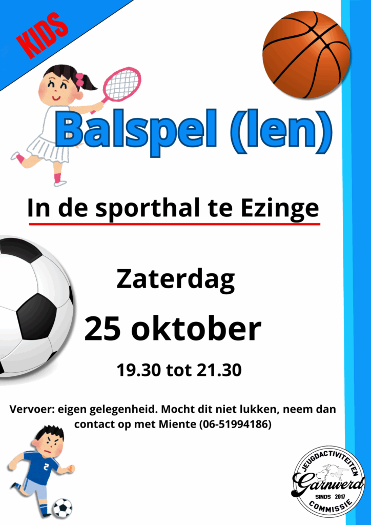 Voor onze volgende activiteit gaan we naar de sporthal in Ezinge. Hier kunnen we verschillende balspellen doen. Denk bijvoorbeeld aan (blokjes)voetbal, trefbal e.d.