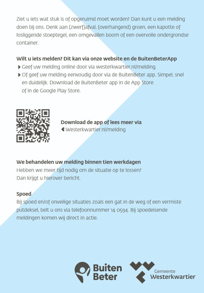(via gem. Westerkwartier) Ziet u iets in de openbare ruimte wat er niet hoort, wat stuk is of waar u last van heeft? Meld het ons via de website of de BuitenBeter app.