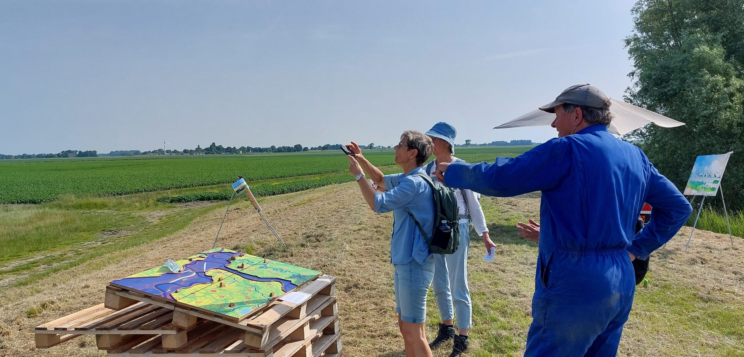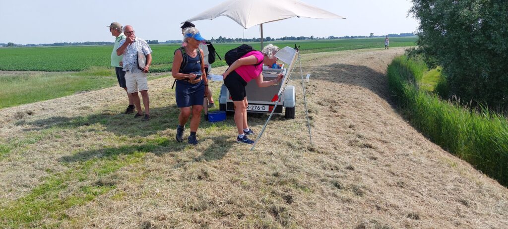 Hierbij zochten we naar een stimulans om even wat langer stil te staan. Op Oldijk kon Bert Terpstra middels z’n contact met Friesland Campina de wandelaars een verfrissend melkproduct aanbieden (wat op de zeer warme dag, dan ook welkom bleek) en bij Koos Bos stond kunstschilder Gerald Schuil onder een parasol op de dijk.