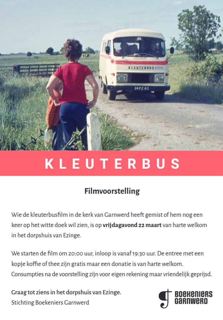 Wie de kleuterbusfilm in de kerk van Garnwerd heeft gemist of hem nog een keer op het witte doek wil zien, is op vrijdagavond 22 maart van harte welkom in het dorpshuis van Ezinge.