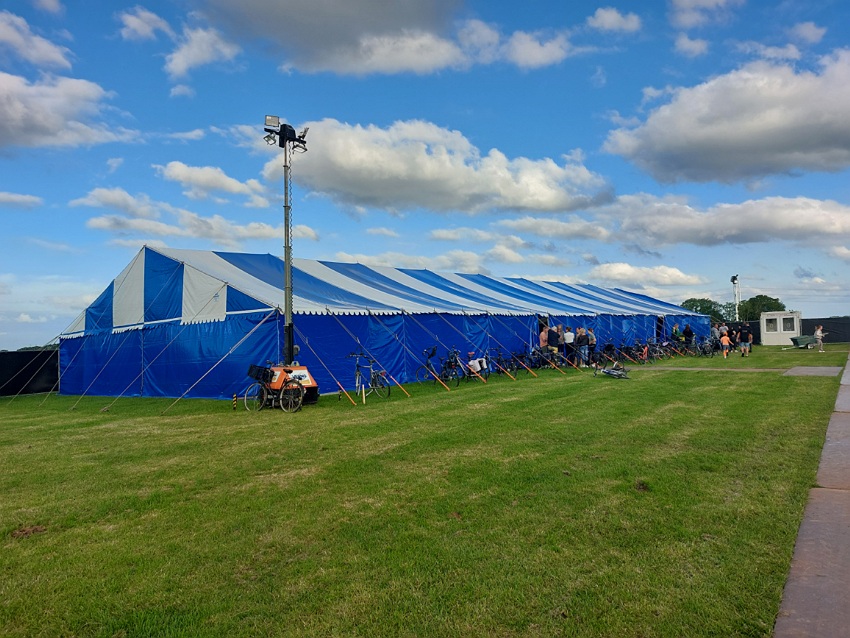 En weer was het een spannend begin van Garnwerd Grandioos. Vorig jaar raasde storm Poly over ons land en nu werd voor afgelopen zaterdag een weeralarm afgegeven, code rood. De feesttent stond net sinds vrijdag. Het begon steeds harder te waaien zodat er hulp nodig was om de feesttent overeind te houden. Met hulp van de boeren en vrachtwagens van Peter Nooren bleef de tent zelfs met windkracht 7 staan.