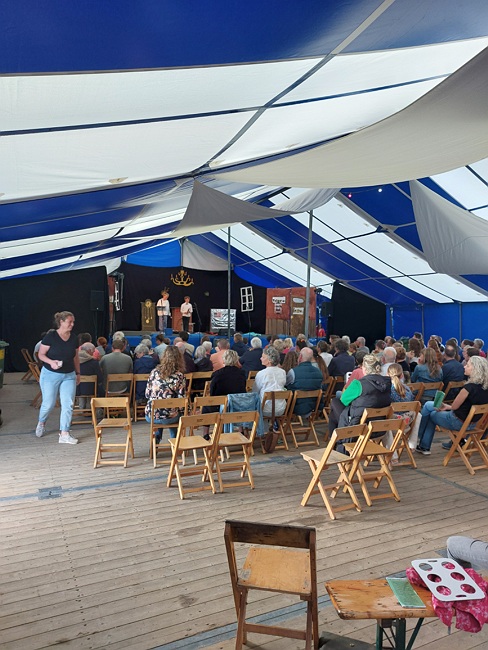 Een halfuurtje eerder dan in het programma stond, omdat het voetbal toch ook belangrijk is, stroomde de tent vol met vaders en moeders, broertjes en zusjes, opa’s en oma’s, neven en nichten, buren en goede bekenden. Ze kwamen allemaal voor de musical ‘Gala vol geheimen’, die gespeeld werd door de leerlingen van de bovenbouw van basisschool Kromme Akkers. Blije spelers, swingende liedjes, enthousiast publiek, trotse juffen en meester, een mooi decor en een geweldig afscheidslied door de leerlingen van groep 8. Hun basisschooltijd is bijna voorbij.