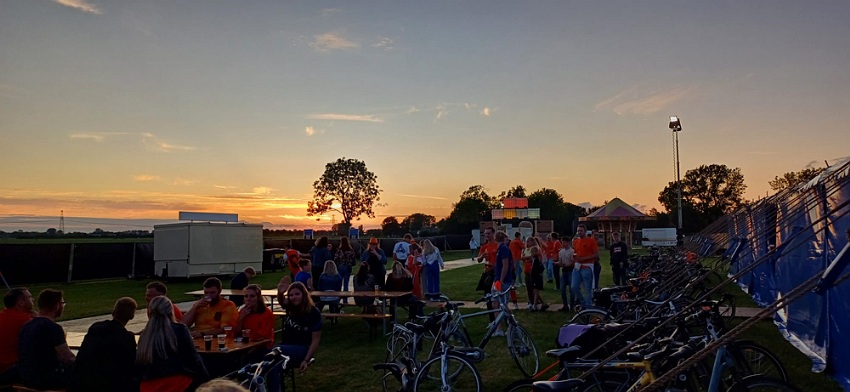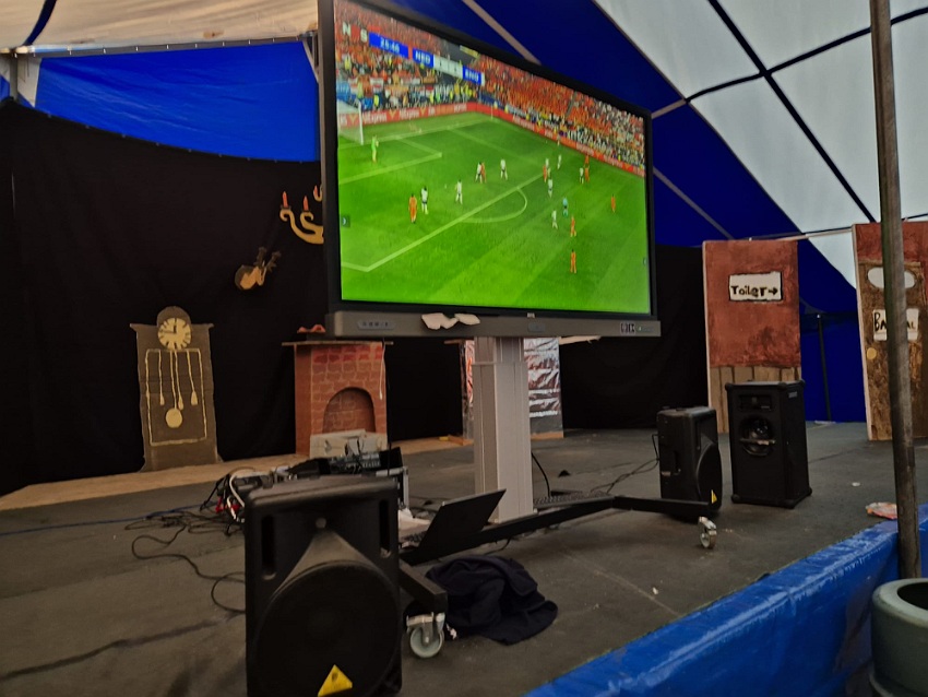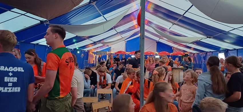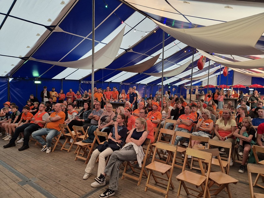 De Oranjefans zaten al in de tent of waren buiten te vinden. Onrustig en wachtend op het begin van de wedstrijd. Gezellig met elkaar voetbal kijken in de feesttent.