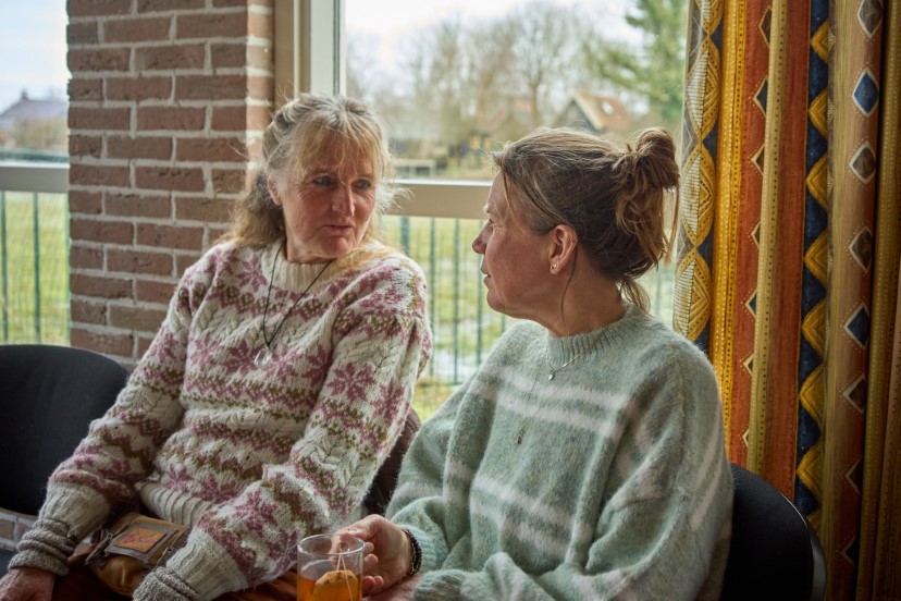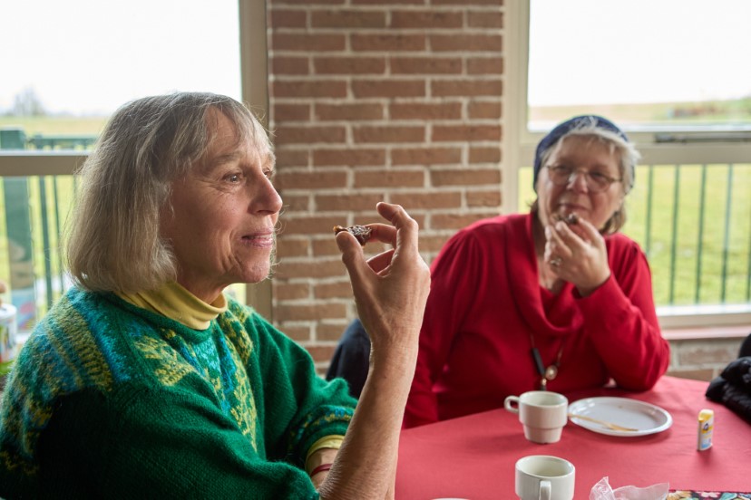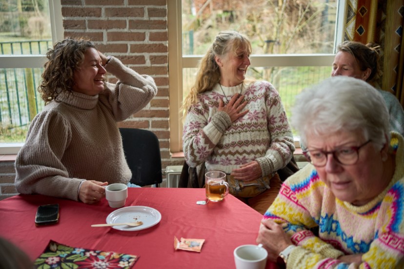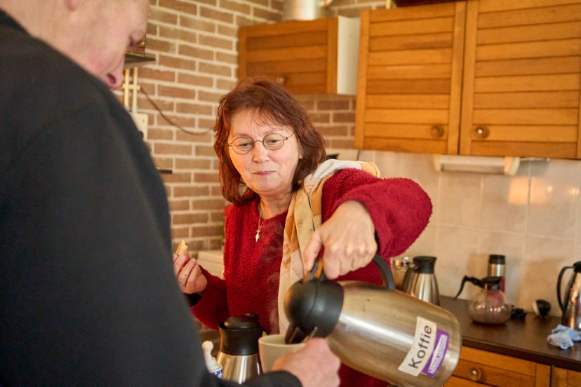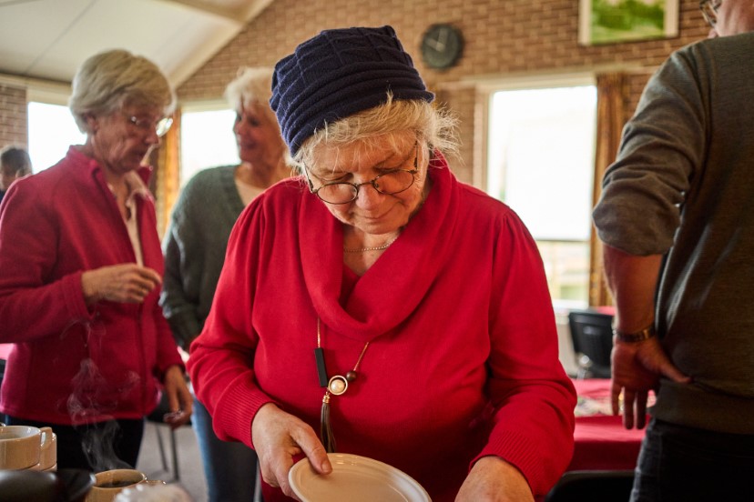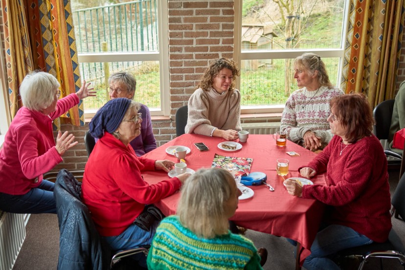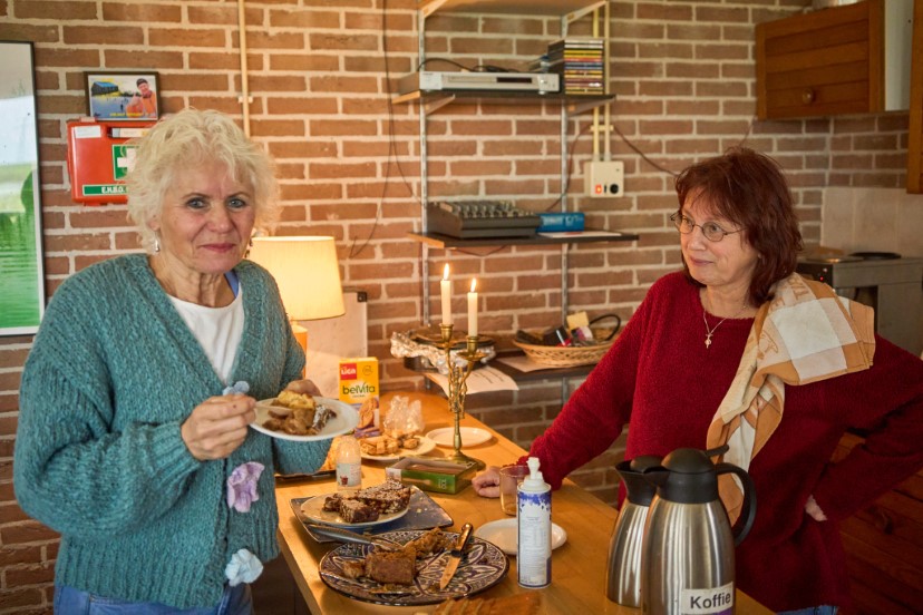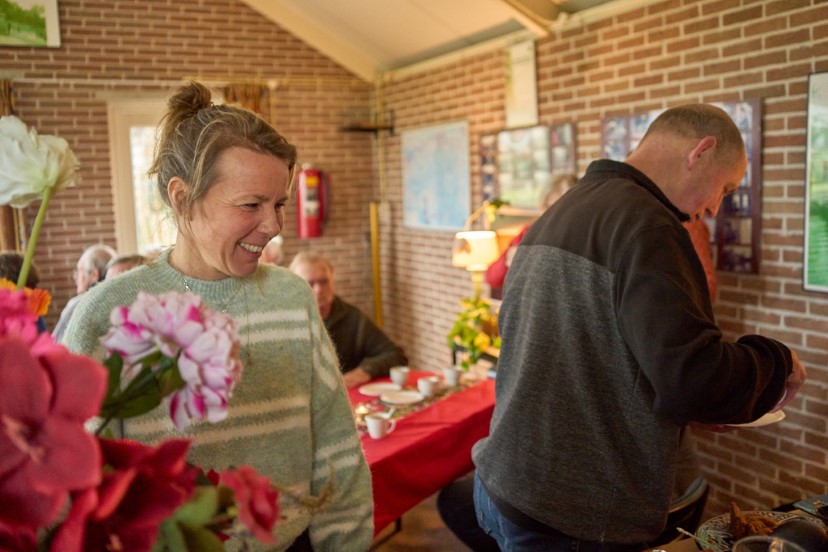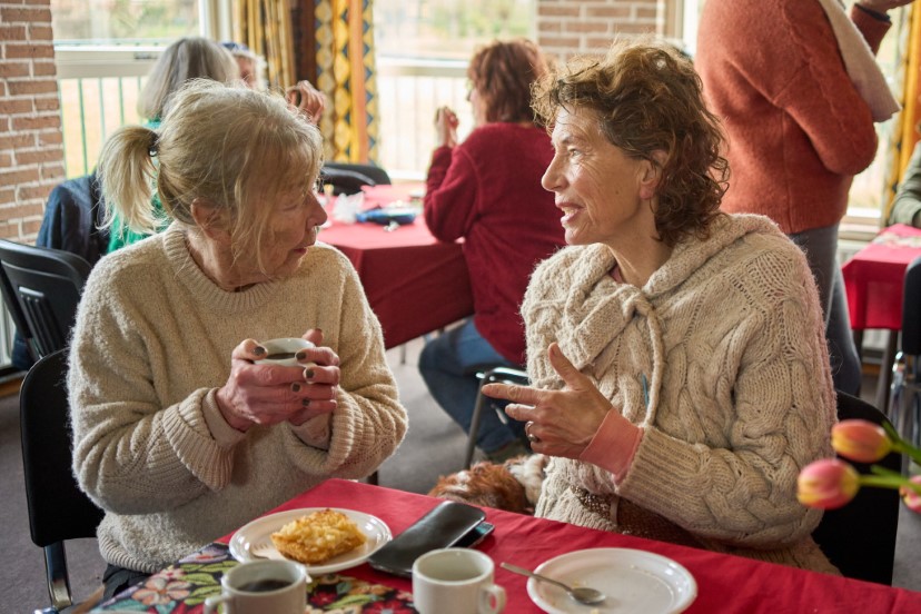 Het IJsbaangebouwtje was, speciaal voor het Inloopcafé, gezellig gemaakt met kleedjes, schemerlampjes en een bloemetje op tafel waardoor het gelijk een huiselijke sfeer had en iedereen zich op zijn gemak voelde. De koffie en heerlijke taarten deden vervolgens de rest.