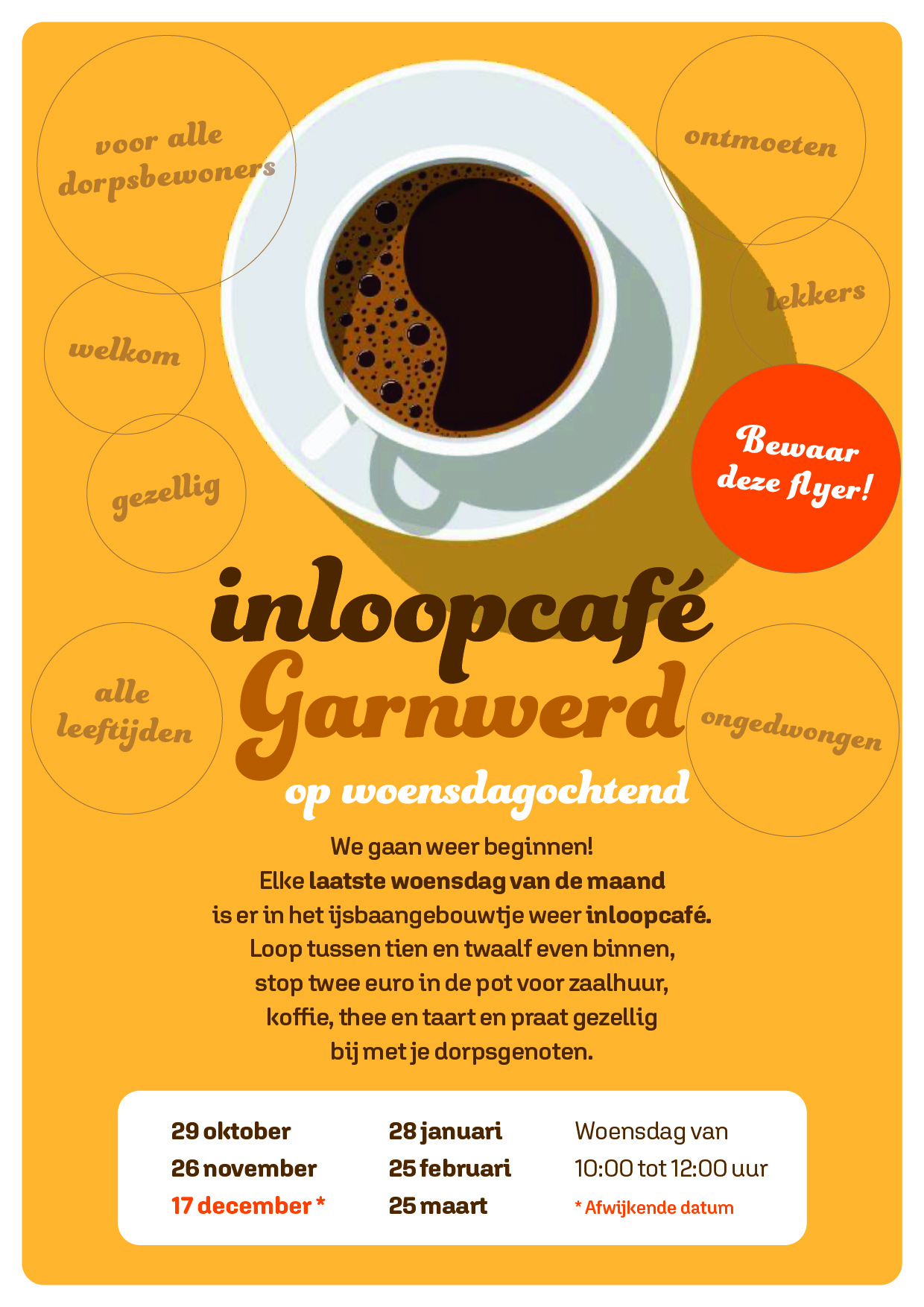 We gaan weer beginnen! Elke laatste woensdag van de maand is er in het ijsbaangebouwtje weer inloopcafé. Loop tussen tien en twaalf even binnen, stop twee euro in de pot voor zaalhuur, koffie, thee en taart en praat gezellig bij met je dorpsgenoten.