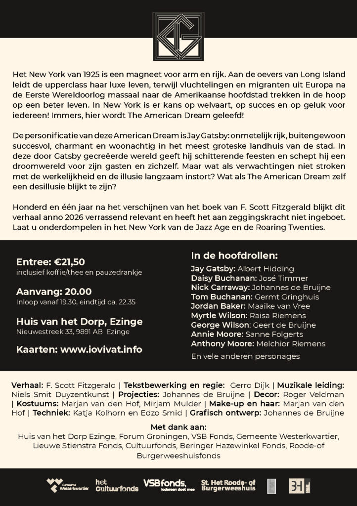 Vanaf 27 februari t/m 8 maart speelt toneelgroep IOVIVAT in Het huis van het dorp in Ezinge The Great Gatsby. Kaarten zijn te bestellen op de website van Iovivat: www.iovivat.info