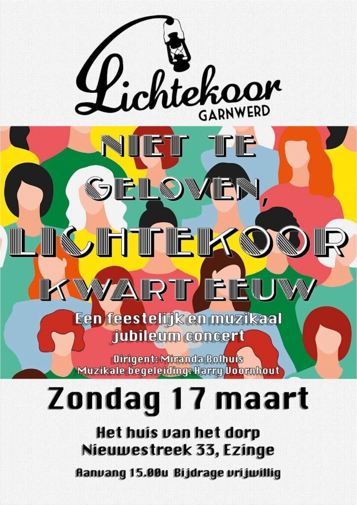 Het is zover; Het Garnwerder Lichtekoor viert feest met als titel: Niet te geloven, Lichtekoor kwart eeuw. We vieren deze speciale gebeurtenis op 17 maart in “het Huis van het dorp Ezinge” , Nieuwestreek 33.
