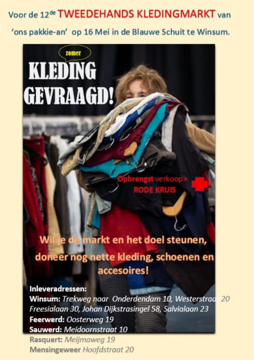 Voor de 12de keer organiseert “Ons pakkie-an” een Kledingmarkt in Winsum! De opbrengst gaat dit keer naar het Rode Kruis.