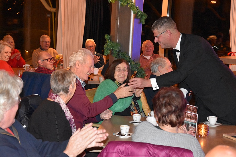 Na een korte pauze was het aan woord aan Miente en Robbert die weer een leuke afwisselende Pubquiz hadden samengesteld. De thema’s waren bv provinciale lekkernijen, Duitse ‘leen’-woorden en het raden van liedjes aan de hand van animatiefilmpjes tot aan Olympische kampioenen en reclameslogans. Het was een spannende strijd. De uiteindelijke strijd om de eerste prijs tussen tafel 4 & 5 werd gewonnen door tafel 5. Zij wonnen een goed gevuld pakket van ‘het Kaas-Notenhuysch’ uit Winsum.
