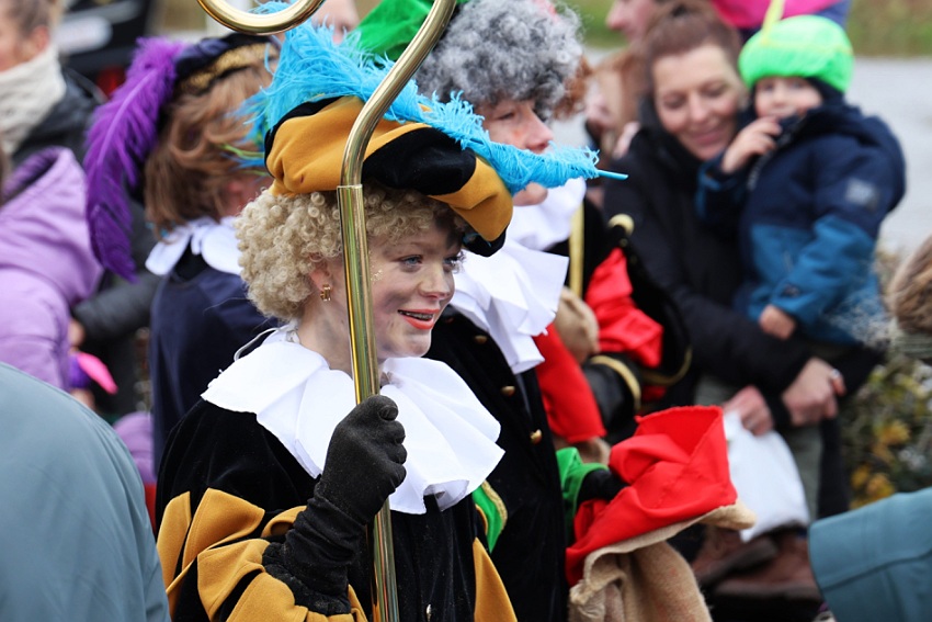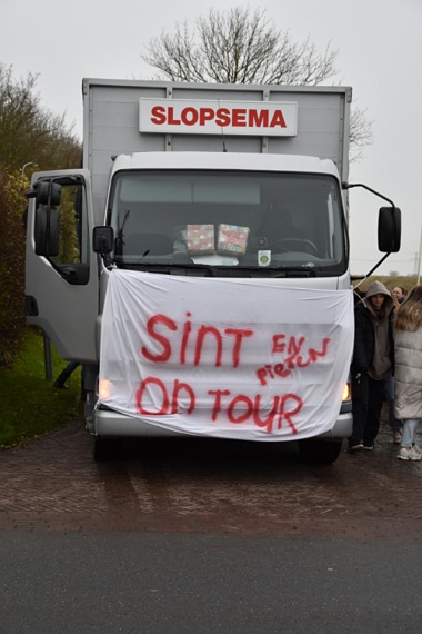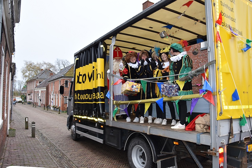 Vrolijke pieten en een blije Sinterklaas zorgden dat het tijdelijk pepernoten regende. Na vele handjes, foto’s, tekeningen in ontvangst nemen en vragen beantwoorden (Hoe komen jullie toch op de daken? Waarom geeft u op uw verjaardag eigenlijk cadeaus weg?) maakte het gezelschap een rondrit op een grote wagen door Garnwerd, Feerwerd, Ezinge en Aduarderzijl.
