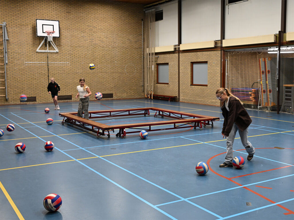 Om 19.30 uur kwamen 3 enthousiaste jonge meiden de sporthal binnen. Eerst nog even bijkletsen over school e.d. Daarna was het tijd om de spieren wat op te warmen. In het midden van de sporthal was een vierkant van banken neer gezet. Hier moesten ballen in gegooid worden. De persoon die in het midden stond moest zorgen dat er na 5 minuten zo weinig mogelijk ballen in het vierkant lagen. Iedere deelneemster stond een keer in het midden. Na een kwartier was iedereen wel opgewarmd en werd er gevolleybald.