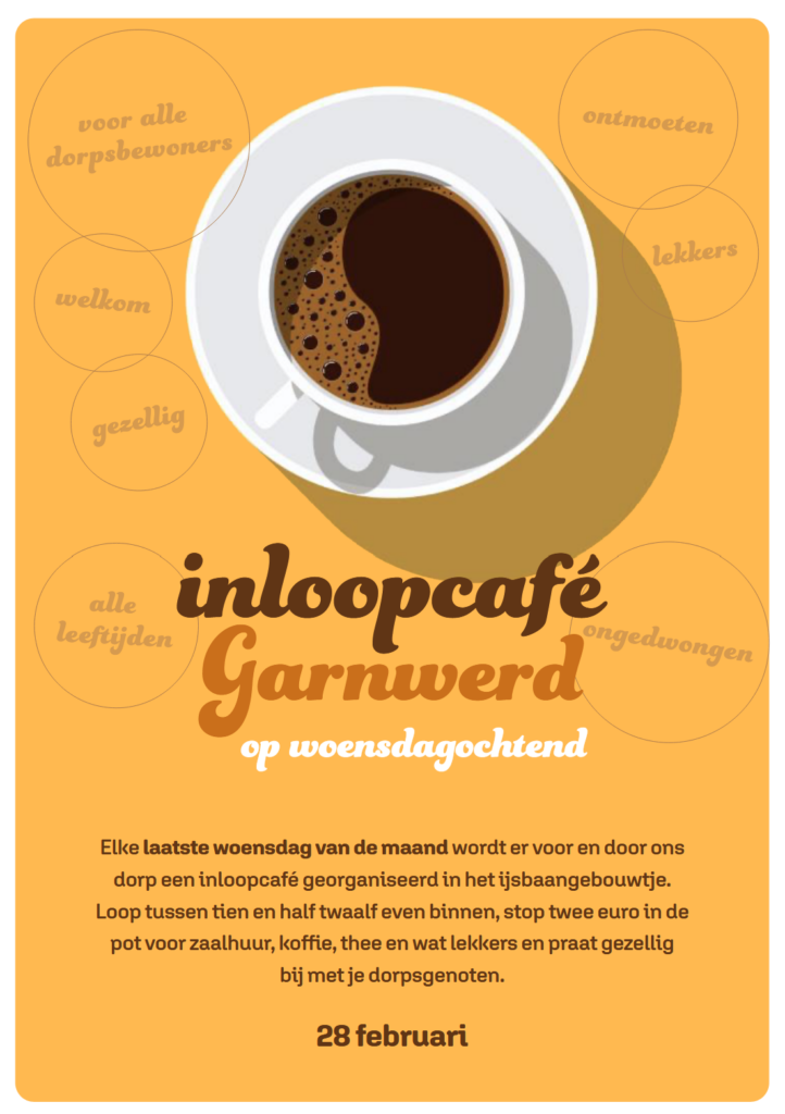 Tip: op deze site staat rechtsboven een rode knop met ‘ABONNEREN’. Als je deze aanklikt, krijg je automatisch een e-mailbericht als er nieuwtjes zijn over het dorp, dus ook wanneer het volgende inloopcafé plaatsvindt.