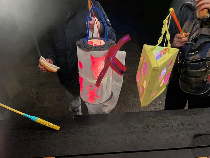 Bij deze wil ik nog een buiging maken voor een dappere jongen, wiens creatie al gesneuveld was voor het echte langs de deuren gaan was begonnen, want hij was door de regen naar Garnwerd komen fietsen en dat had de lampion niet overleefd.