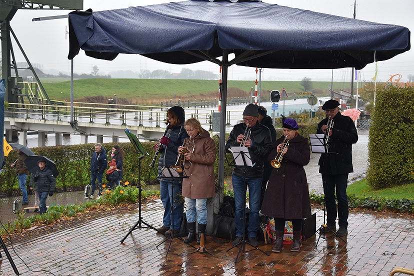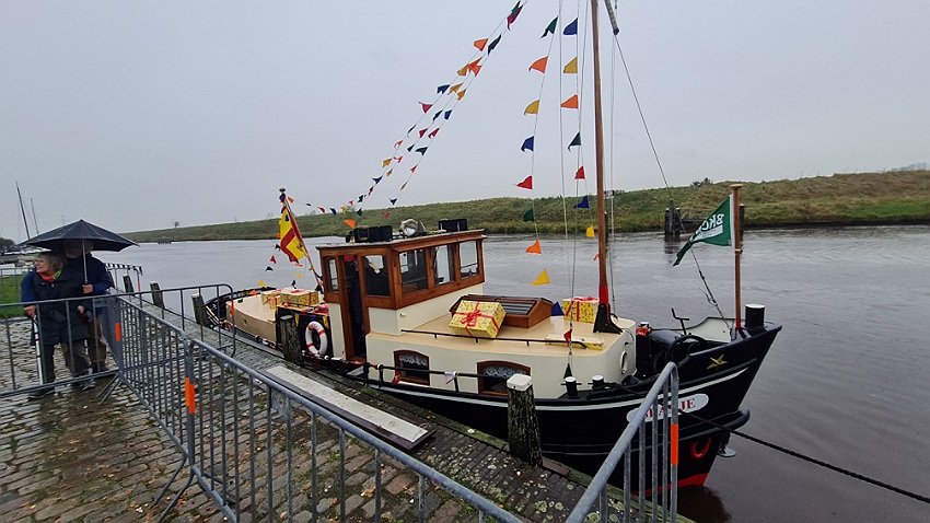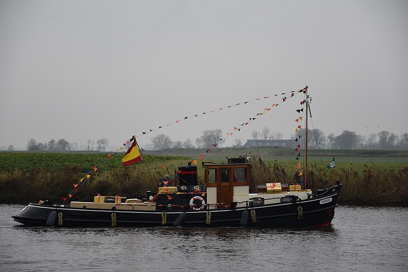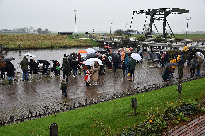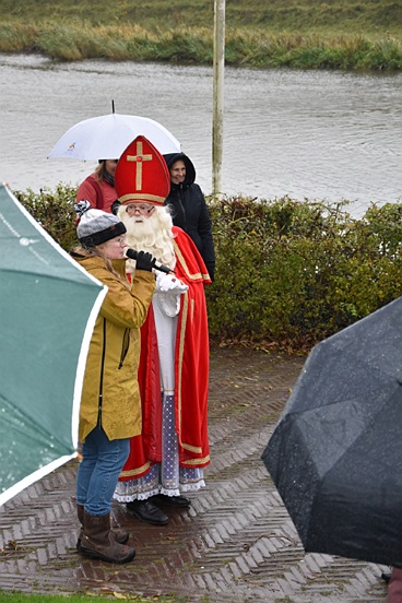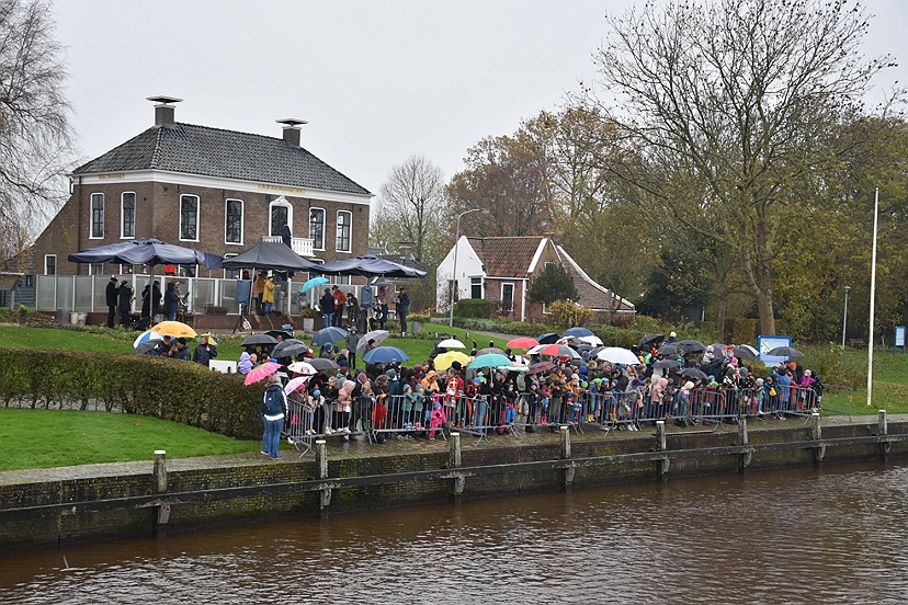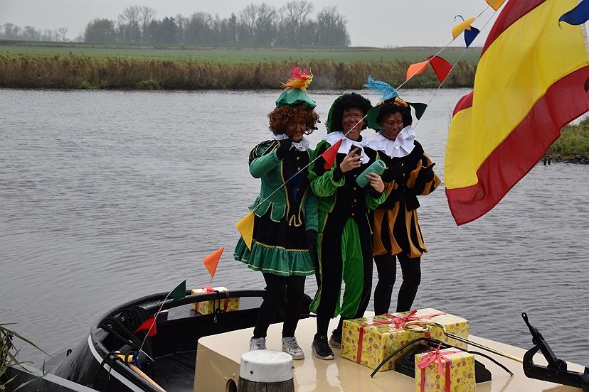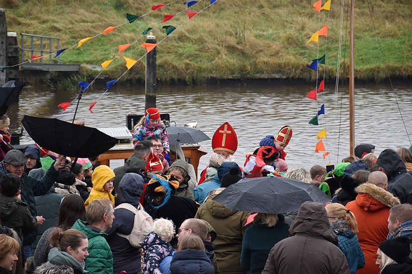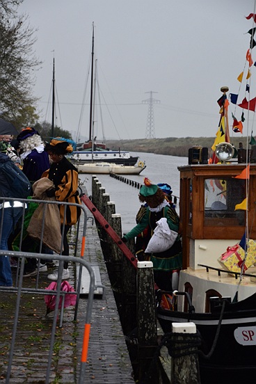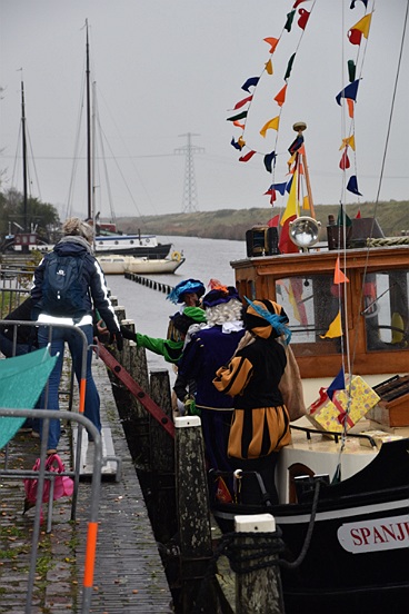 Vandaag zijn Sinterklaas en zes Pieten met hun allermooiste binnenvaartboot aangekomen in Garnwerd. Op de kade voor café Hammingh stond De Eendracht vrolijk te spelen en er stonden heel veel kinderen uit Ezinge, Feerwerd en Garnwerd met hun ouders het bezoek zingend te verwelkomen. Het was een natte intocht, maar dat kon niemand deren.