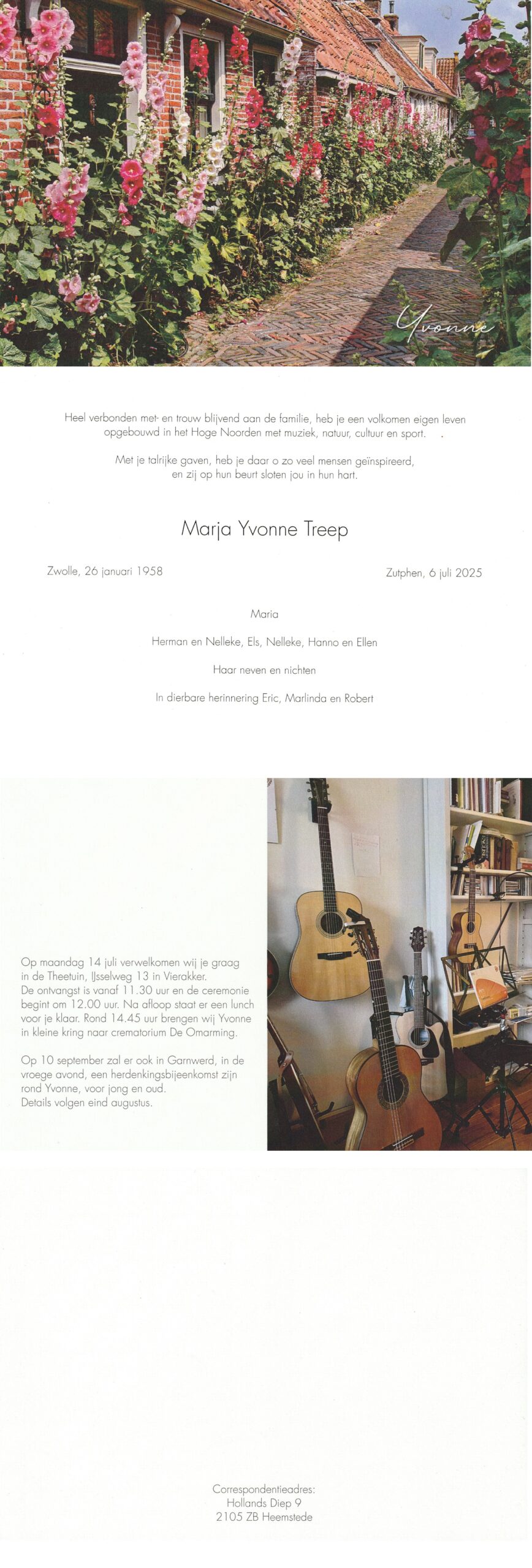 Begin deze week bereikte ons het verdrietige bericht dat Yvonne Treep is overleden. Begin dit jaar werd Yvonne ziek en vrij snel daarna opgenomen in het ziekenhuis. Haar laatste dagen verbleef ze (dicht) bij haar familie in de Achterhoek.